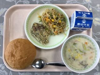 <今日の献立>まるパン 牛乳 サメの香草パン粉焼き スパゲティーソテー 白菜の味噌クリームシチュー