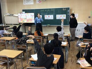 <4年生>ALTとの外国語の学習でした。外国語の授業では、「チャンツ」という言葉をよく耳にします。「チャンツ」とは、リズムに合わせて言葉を繰り返し発音する学習方法です。英単語や英文を、リズムに乗せて発音することで、英語特有のイントネーションやリズム感を習得できるのです。今日は、「What do you want?」の英文で、果物や野菜の名前を学びました。