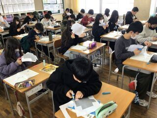 2年1組も、版画作品の制作が始まりました。大きな木、大きな雪だるま、大きな…。今日は、大きく描くことがテーマのようです。今日から始まった版画なのに、どんどん下描きが進む子どもたち。きっと、作りたい作品のイメージが、もうできているのでしょうね。自分の作品づくりに、しっかりと集中していましたが、話しかけると、どんな作品を作りたいか、たくさん教えてくれました。