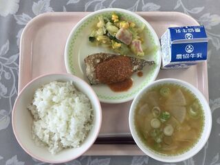 <今日の献立>ごはん 牛乳 厚揚げと大豆の味噌ケチャップがらめ のりたく和え 鶏野菜味噌汁
