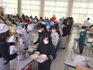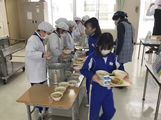 今日は、6年生の親子活動がありました。1・2年生が雪遊びに出かけているので、6年生のおうちの方に来ていただき親子給食会です。盛り付けや配膳も、役員の方にお手伝いしていただきました。〇年ぶりの給食当番は、いかがだったでしょうか。配膳台が、とっても低く感じたかもしれませんね。小学校時代を思い出しながら、手際よく盛り付けてくださいました。