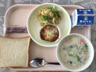 <今日の献立>食パン 牛乳 いちごジャム ひじきと大豆のチーズ焼き アスパラ菜のフレンチサラダ クリームシチュー