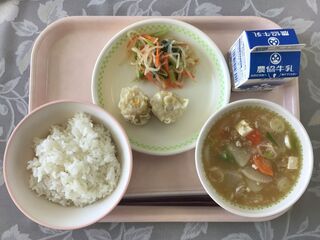 焼売は、コーンがたくさん入っていて、とっても甘みがありました。今どきの焼売は、グリーンピースではなくコーンなのですね。サラダは、春雨ののつるりとしたのど越しが楽しかったです。五目中華煮は、とろみがありニンニクと生姜が入っていたので、身体がとても温まりました。具だくさんで、お腹いっぱいになりました。調理員さん、今日も安心・安全でおいしい給食を、ありがとうございました。