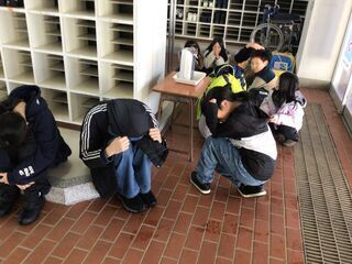 いつも通りの清掃活動をしているときに、緊急避難の指示が出ました。清掃場所担当の職員がいる場所は、職員が指示を出します。近くに職員がいない場合は、自分たちで考えて命を守る行動をとります。高学年が下学年に指示を出し、放送での指示を待っているようでした。校内は、シーンと静まり返り、緊張感のある訓練でした。