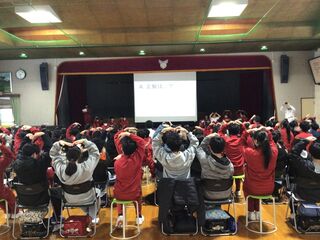 避難完了後、地震に関するクイズを出しました。学校にいるときに、地震が起きるとは限りません。家にいるときに地震が起きたら、最初にとるべき行動は?おうちの人がいなかった場合はどうする?火事を防ぐにはどうする?外にいるときに地震が起きた場合は?様々な場面を考えて、命を守る学習をしました。ちなみに、エレベーターの中にいるときに地震が起きた時は、すべての階のボタンを押し、最初に扉が開いた階で降りるのが正解です。