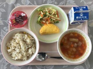 <今日の献立>ツナコーンごはん 牛乳 オムレツ ミネストローネ いちごのムース