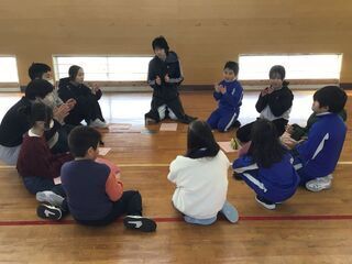 <1年生>音楽発表会で発表した、わらべ歌を披露してくれました。沖縄の三線の音色、独特なメロディーに、あっという間に引き込まれた1年生。沖縄の手遊びが入った歌も披露してくれました。1年生も、体を揺らしたり振り付けを真似したりしながら、わらべ歌を楽しみました。沖縄の方言も、たくさん教えてもらいました。