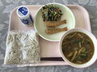 <今日の献立>ソフトめん 発酵乳(プレーン) カレー南蛮汁 イワシのカリカリ焼き 磯和え