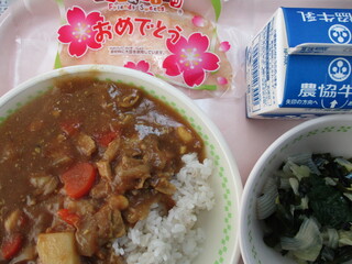 4月15日(水)からは、一年生も給食が始まります。献立は、ポークカレーです。献立を聞いた一年生は、みんな大喜びでした。