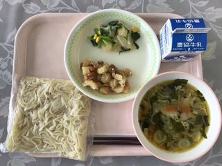<今日の献立>ソフトめん 発酵乳(プレーン) カレー南蛮汁 イワシのカリカリ焼き 磯和え