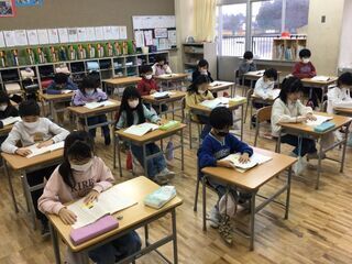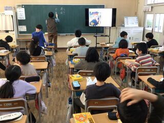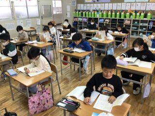 <2年1組>「みきのたからもの」という、国語の物語文の学習でした。物語に登場する、「ナニヌネノン」になり切るには、どんな音読の仕方がよいか、練習していました。「、」で区切って読む、ずっと同じ調子で読むなど、ポイントがあるようです。発表している子どもの音読を聞くと、何だか宇宙人のような読み方で、思わず吹き出してしまいました。家庭でも、子どもの音読を聞いてみてください。