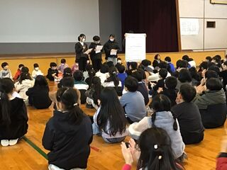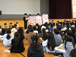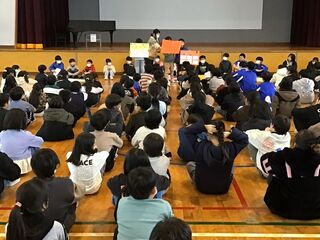 11月22日(水)~12月5日(金)までは、思いやり旬間でした。「いじめをしない、させない、許さない」心を育て、相手を思いやったかかわりができるよう、学年・学級で話し合い、「思いや活動」を行ってきました。今日の昼休み後半は、全校で思いやり活動の振り返り集会を開き、学年・学級の取組を紹介しました。